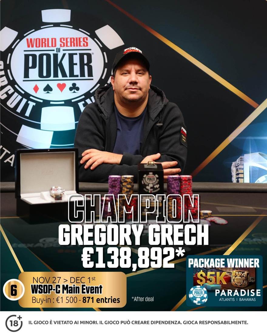Sventola la bandiera francese sul Final Table del Main Event WSOP di Sanremo.  Gregory Grech ha ricevuto la prima moneta del valore di €138.892 l’anello e un pacchetto di 5.000$ per le Bahamas. Una vittoria incredibile coronata da un percorso perfetto sino all’ultimo punto del Final Table.  Sul podio accanto a lui due italiani, che hanno ben difeso i colori nazionali: Luca Berardi che ha meritato il secondo posto ricevendo € 128.000 e  Alessandro Orsi terzo con € 79.000.