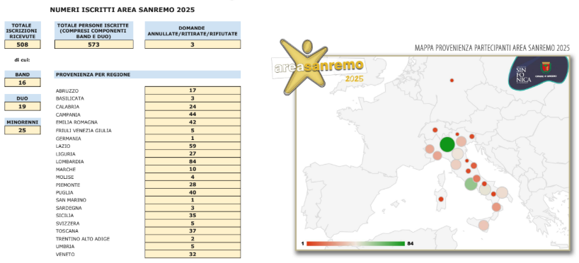 Il Presidente della Fondazione avv. Filippo Biolé, commenta: “Siamo molto soddisfatti del numero di iscrizioni raggiunto, superiore a quello dello scorso anno, quando i candidati erano stati 336. Si tratta di un risultato atteso, frutto di un costante lavoro di valorizzazione del concorso che portiamo avanti con grande impegno da quattro anni. Oggi possiamo affermare che Area Sanremo accompagna e sostiene i sogni dei giovani artisti durante tutto l’anno, grazie a un insieme di attività che trovano spazio e attenzione anche sui nostri canali digitali. Solo nell’ultimo anno, su Instagram abbiamo registrato una crescita della copertura del +264,5% rispetto al 2024 e un incremento del +100% delle interazioni, un dato significativo anche dal punto di vista qualitativo. Le iniziative sviluppate durante l’anno, la strategia di comunicazione, le collaborazioni attivate e l’approdo diretto al Festival garantito ai due vincitori rendono il nostro concorso sempre più attrattivo e distintivo nel panorama nazionale. Ora ci prepariamo ad accogliere i 505 giovani artisti provenienti da tutta Italia. Desidero ringraziare fin d’ora il nostro staff e tutti i collaboratori impegnati nel progetto per il lavoro svolto e per quello che li attende durante l’Area Sanremo Music Week.”