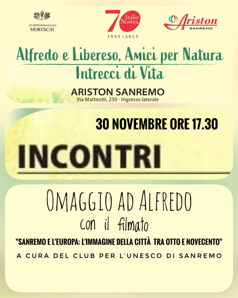 Nel pomeriggio di domenica 30 novembre 2025, nell’ambito della MOSTRA “ALFREDO E LIBERESO, AMICI PER NATURA. INTRECCI DI VITA” presso l’ex discoteca Whisky a Go Go dell’Ariston Sanremo, Italia Nostra Sanremo Taggia e Archivio Fotografico Moreschi, ha avuto luogo la proiezione del filmato relativo alla mostra del luglio 2018 “Sanremo e l’Europa – l’immagine della città tra Otto e Novecento” Presso il Forte di Santa Tecla a Sanremo.