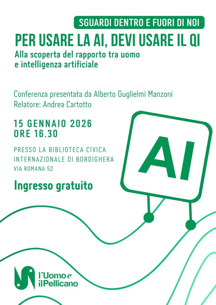 Giovedì 15 gennaio 2026 alle ore 16.30 presso la Biblioteca Civica Internazionale di Bordighera sarà presentata la conferenza “Per usare la AI, devi usare il QI: alla scoperta del rapporto tra uomo e intelligenza artificiale” a cura della Fondazione l’Uomo e il Pellicano.