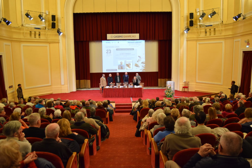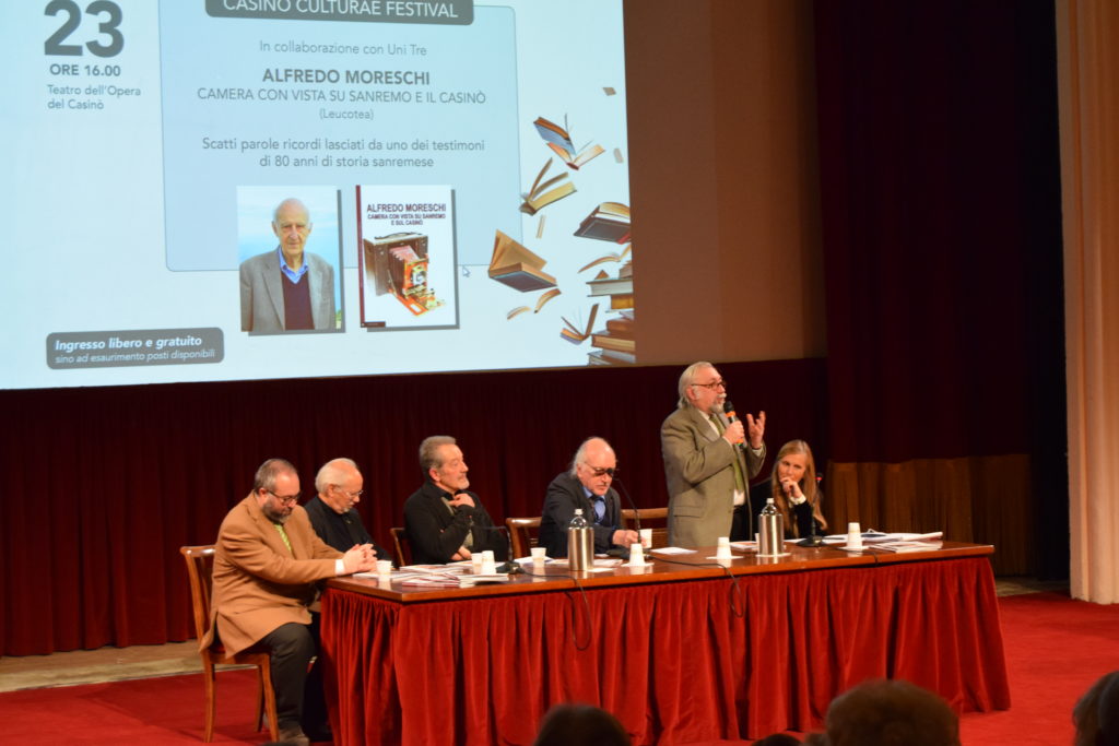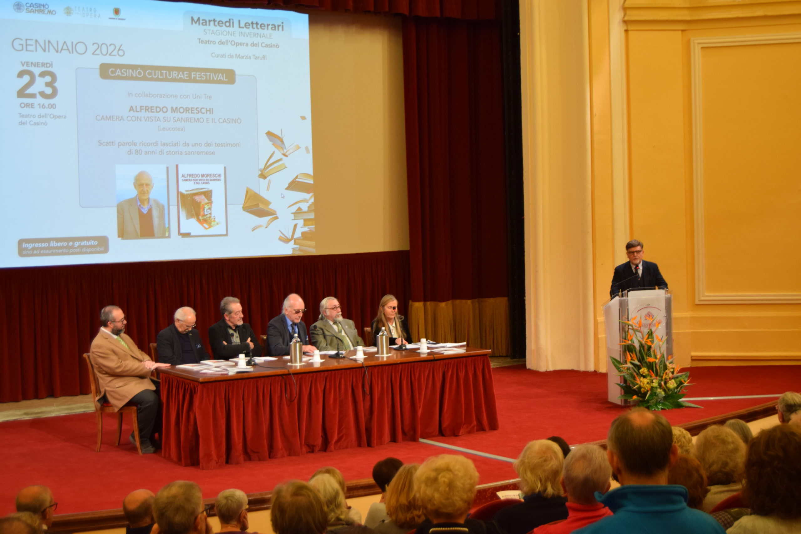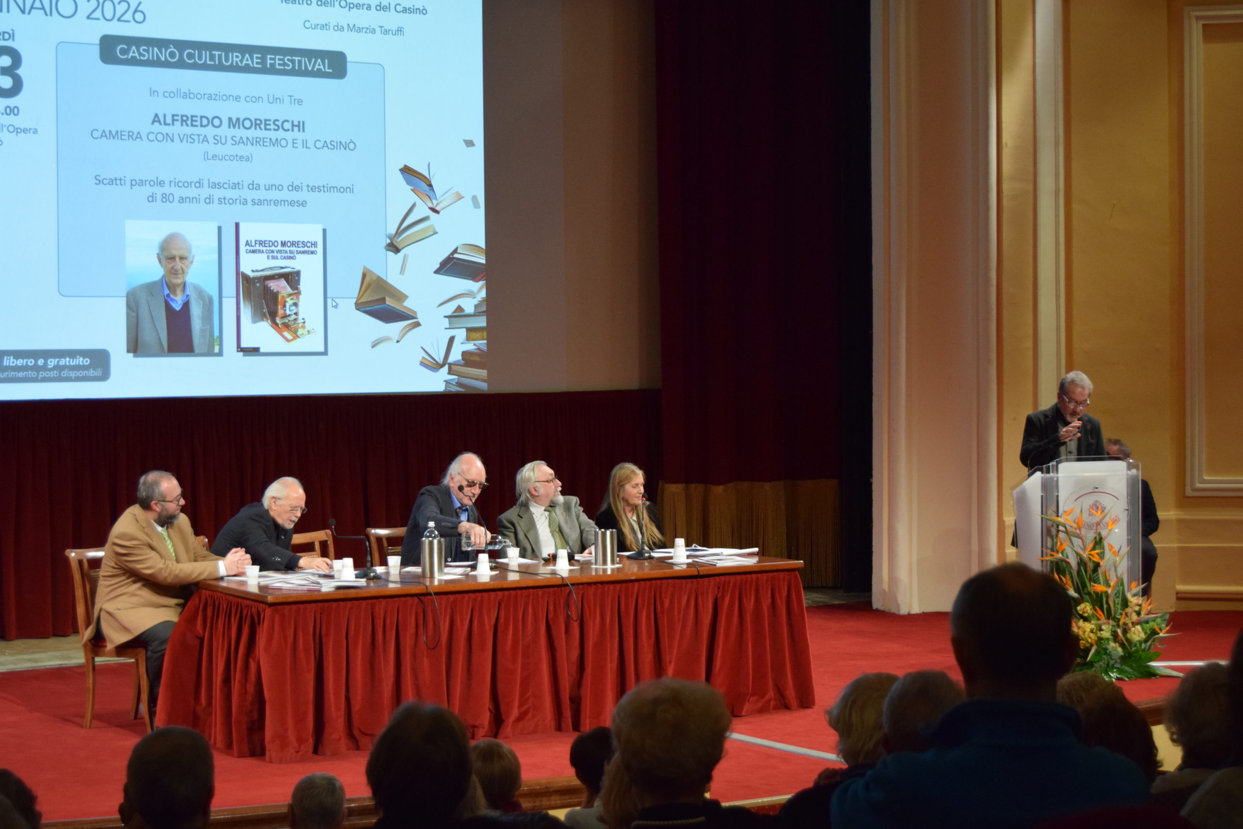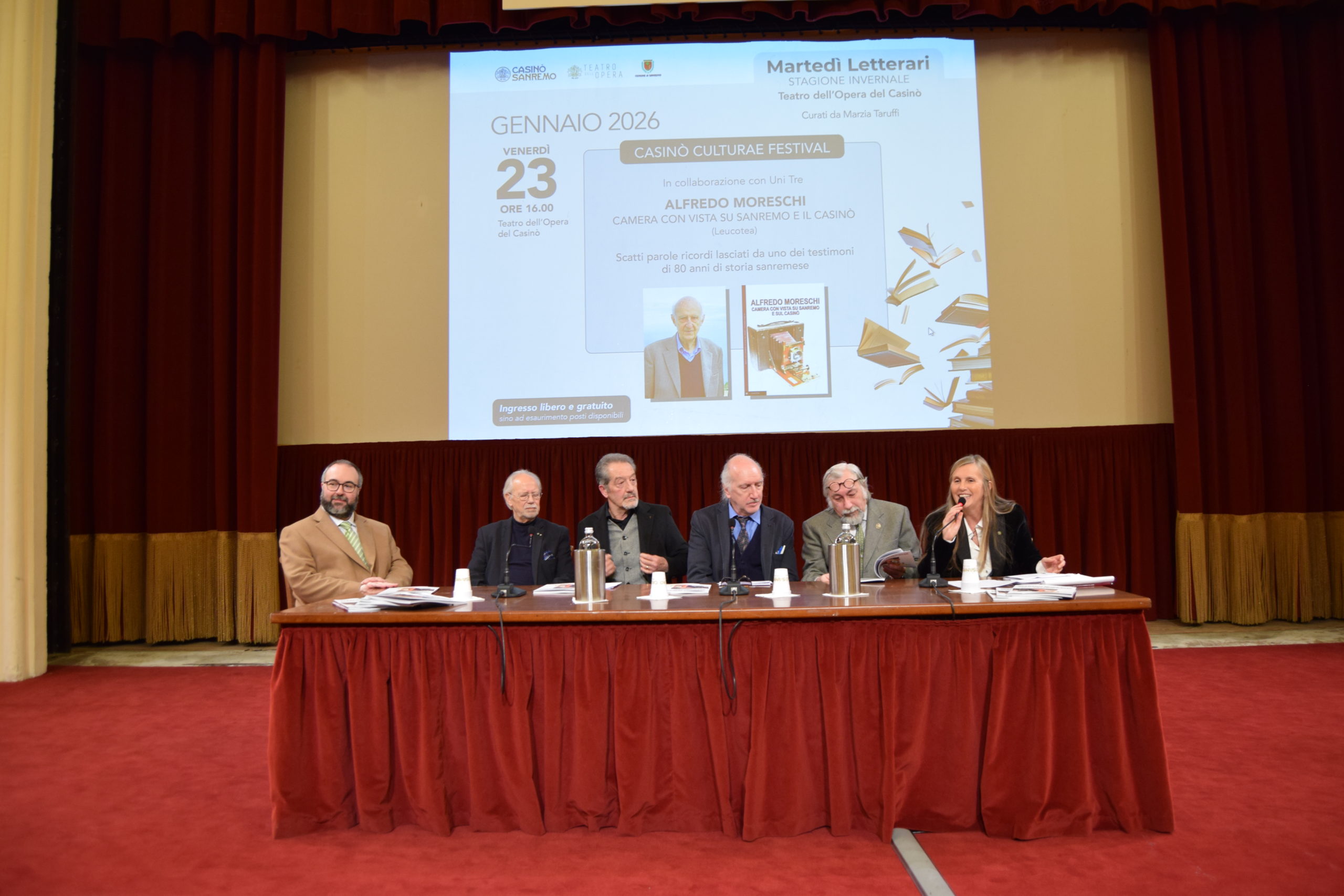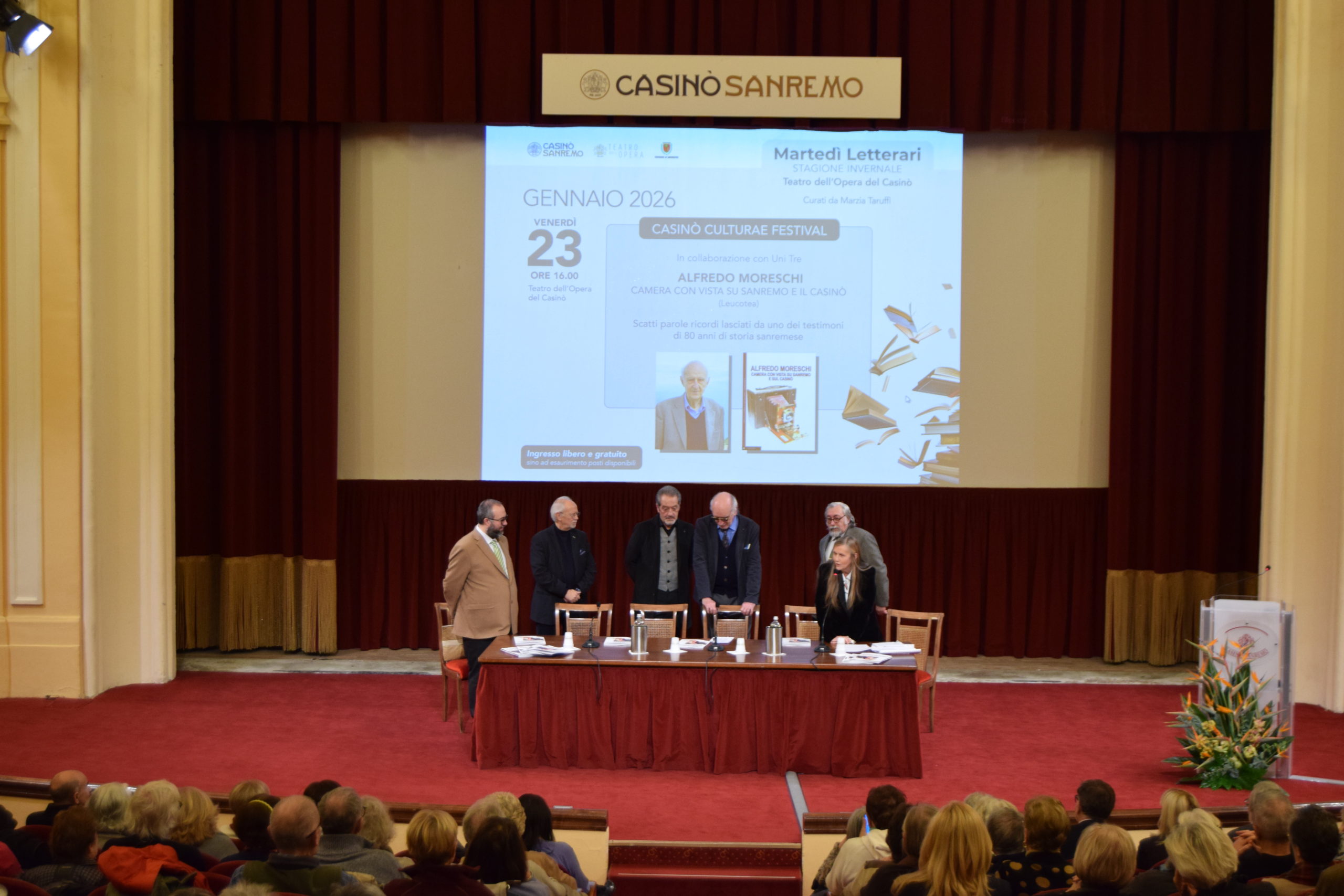 Nel pomeriggio del 23 Gennaio 2026 nel TEATRO dell’OPERA del Casinò di Sanremo ha avuto luogo con successo di pubblico il primo appuntamento de ” Casinò Cultura e Festival ” inserito nell’ambito della rassegna dei Martedì Letterari 2026 curati da Marzia Taruffi , dedicato alle opere legate alla storia della Casa da Gioco e al territorio ligure. La presentazione del volume ” ALFREDO MORESCHI CAMERA CON VISTA SU SANREMO E SUL CASINO'” -LEUCOTEA -dedicato all’artista fotografo Alfredo Moreschi ha coinvolto alcuni dei suoi amici e personaggi che appartengono al mondo della cultura e della musica di Sanremo quali: Roberto Pecchinino, Elio Marchese, Marco Innocenti, Freddy Colt ed un numeroso pubblico. L’evento è stato presentato dalla Dott.ssa Marzia Taruffi e dall’editore di LEUCOTEA Dott. Matteo Moraglia.