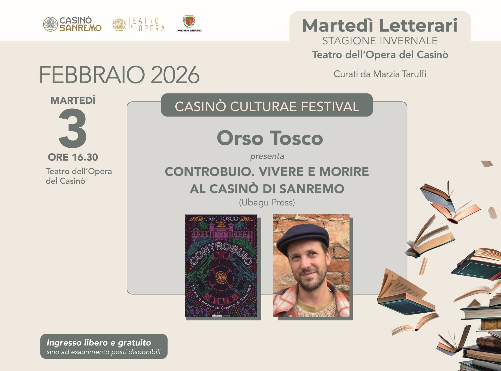 Un giallo da sceverare domani martedì 3 febbraio in sala Privata con lo scrittore Orso Tosco che parlerà del suo “Controbuio. Vivere e morire al Casinò di Sanremo”. ( Ugabu Press) Targa Premio Casinò di Sanremo Antonio Semeria. Ingresso libero sin ad esaurimento dei posti disponibili.