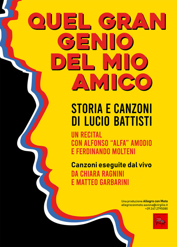 Venerdì 6 marzo alle ore 21:00 il Teatro dell’Attrito di San Lorenzo al Mare (IM) ospiterà “Quel gran genio del mio amico – Storia e canzoni di Lucio Battisti”, recital musicale scritto da Ferdinando Molteni e interpretato da Alfonso “Alfa” Amodio e Ferdinando Molteni, con le canzoni eseguite dal vivo da Chiara Ragnini e Matteo Garbarini, accompagnati dai racconti di Ferdinando Molteni e Alfonso “Alfa” Amodio.