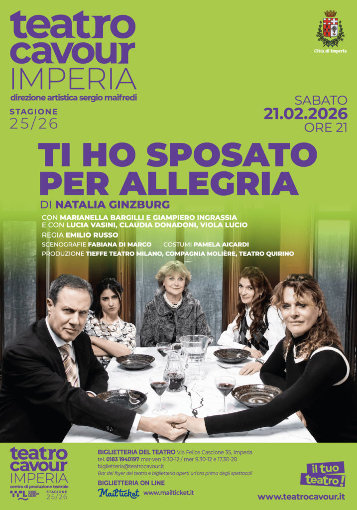 Facebook del Teatro Cavour La vertigine della vita di una coppia sposata da una settimana tra convenzioni e anticonformismo, con un menu che – chissà perché – prevede sempre e solo melanzane alla parmigiana. È ricca di comicità e di sincerità brutale la commedia “Ti ho sposato per allegria” di Natalia Ginzburg, in programma al Teatro Cavour di Imperia sabato 21 febbraio 2026 alle ore 21, in abbonamento nella Stagione 25/26 con la direzione artistica di Sergio Maifredi. In scena un cast di attori noti formato da Giampiero Ingrassia, figlio di Ciccio Ingrassia componente dell’indimenticabile duo comico Franco e Ciccio, Marianella Bargilli, diretta in teatro da Alfredo Arias e Andrée Ruth Shammah tra i molti altri, Lucia Vasini, attrice con Dario Fo e Franca Rame, Gabriele Salvatores, Paolo Rossi solo per fare qualche esempio, Claudia Donadoni e Viola Lucio, con la regia di Emilio Russo. Scenografia di Fabiana Di Marco e costumi di Pamela Aicardi, produzione Tieffe Teatro, Compagnia Molière e Quirino srl. Biglietti primo settore intero 25 euro; ridotto 20 euro, secondo settore intero 20 euro e ridotto 18 euro; galleria intero 18 euro, ridotto 15 euro. Biglietteria del teatro in via Felice Cascione 35, a Imperia, tel. 0183 1940197, biglietteria@teatrocavour.it Biglietteria on line www.mailticket.it Biglietteria aperta un’ora prima degli spettacoli, dal martedì al venerdì dalle 9.30 alle 12, il mercoledì anche dalle 17.30 alle 20. Aggiornamenti su www.teatrocavour.it