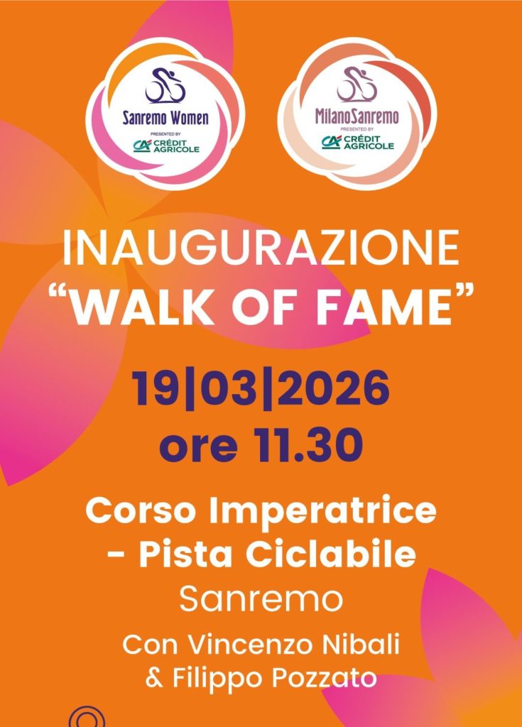 Giovedì 19 marzo 2026, sulla pista ciclabile di Sanremo uno straordinario evento sportivo il “WALK OF FAME” alla presenza dell’Amministratore Delegato RCS Paolo Bellini e due campioni del mondo del ciclismo Vincenzo Nibali (vinse la Milano-Sanremo 2018) e Filippo Pozzato (vinse la Milano-Sanremo 2006), con gli amministratori del Comune di Sanremo il Sindaco Alessandro Mager, l’Assessore al Turismo Alessandro Sindoni, gli Assessori Ester Moscato, Silvana Ormea, Fulvio Fellegara, e il Presidente del Consiglio Alessandro Il Grande.