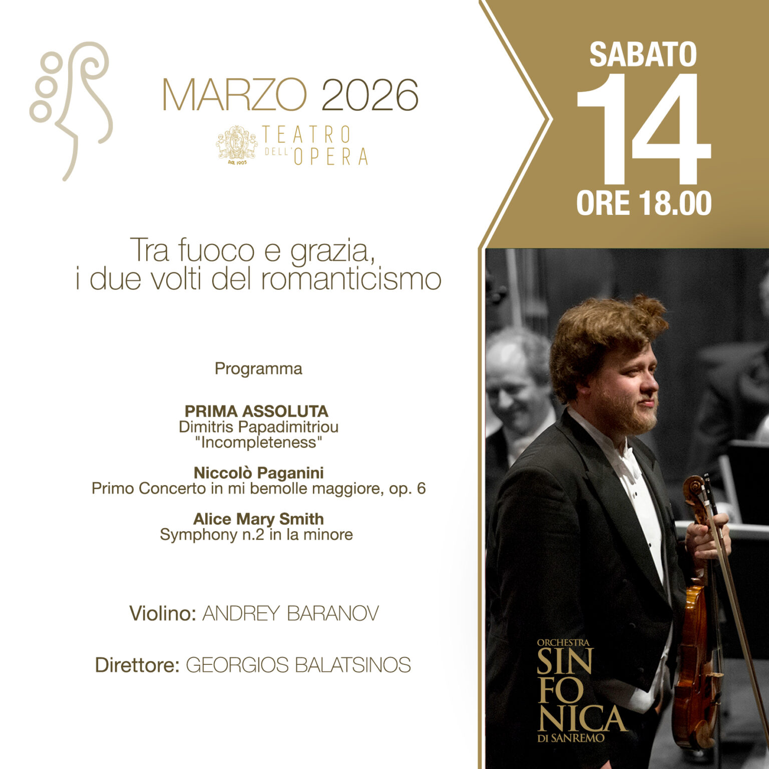 Il concerto, in programma sabato 14 marzo alle ore 18.00 al Teatro dell’Opera del Casinò di Sanremo, proporrà nel programma una figura significativa e ancora poco conosciuta del panorama sinfonico europeo: la compositrice inglese Alice Mary Smith. Accanto a questa preziosa riscoperta, il concerto presenterà anche una prima assoluta, Incompleteness del compositore greco Dimitris Papadimitriou, e Il Concerto per violino n. 1 in mi bemolle maggiore, Op. 6 di Niccolò Paganini, uno dei capolavori del virtuosismo violinistico romantico, celebre per la brillantezza tecnica, il carattere teatrale e le straordinarie difficoltà che mettono in luce tutte le possibilità espressive del violino.