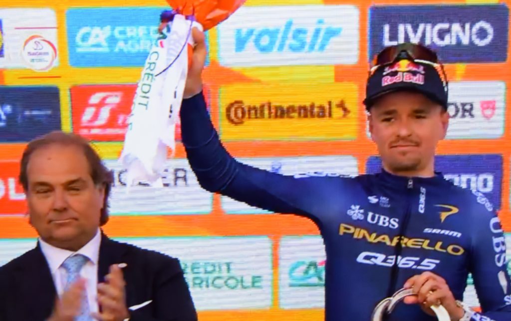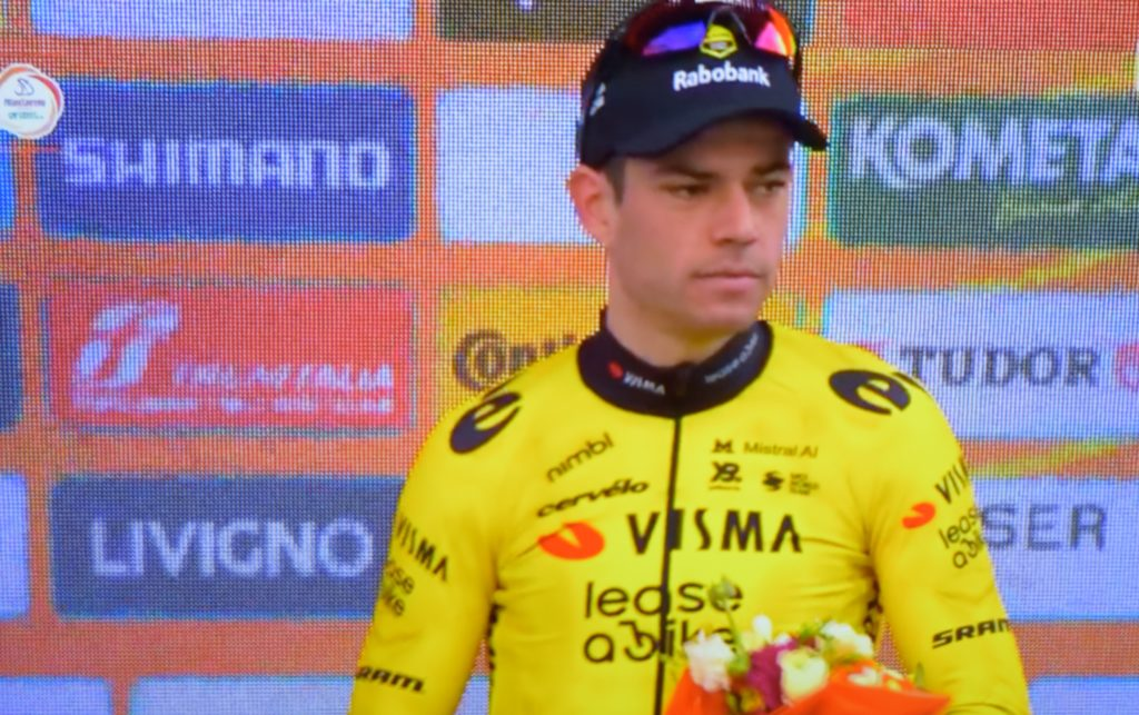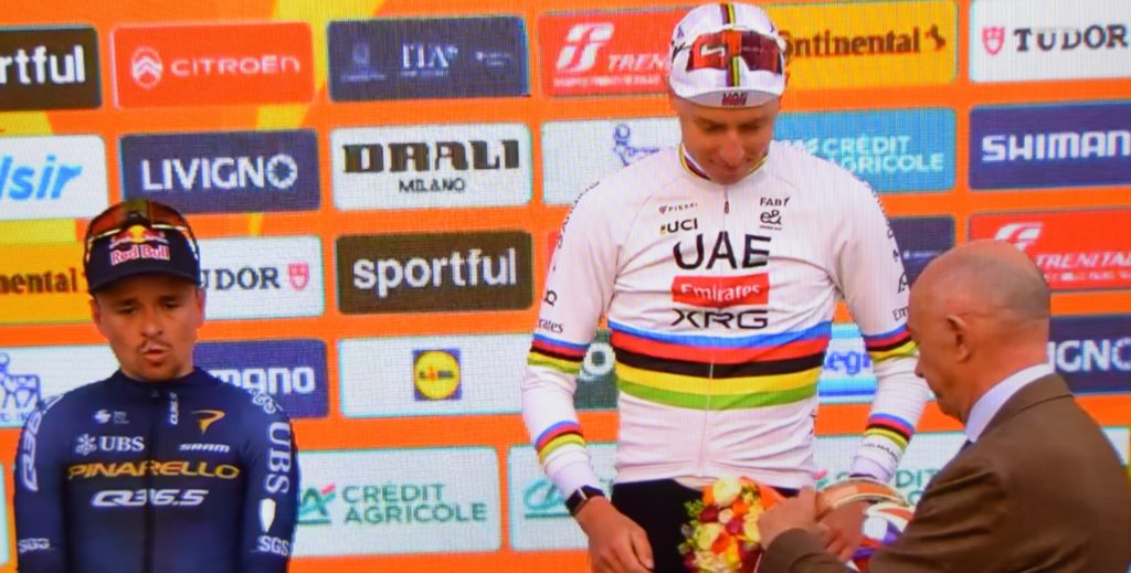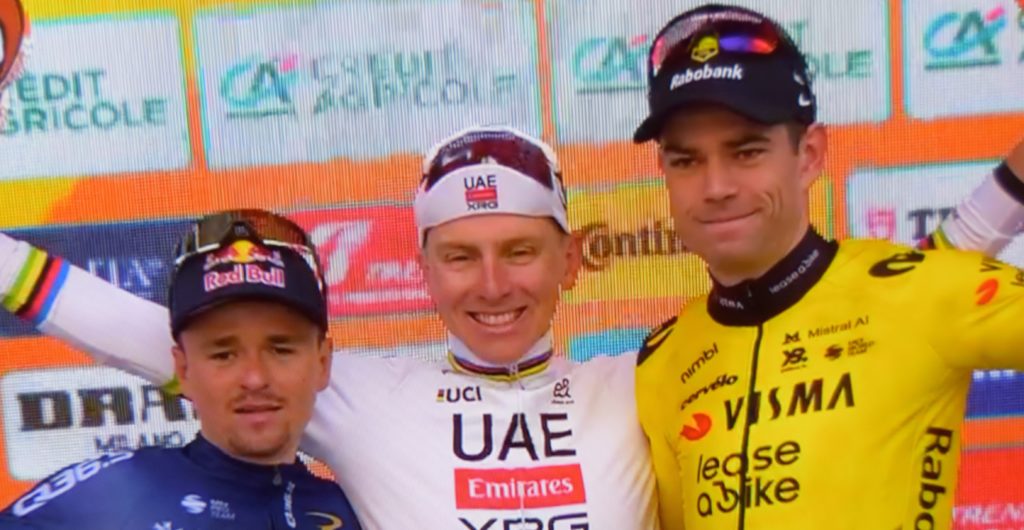 Sul podio con il Vincitore Tadej Pogacar al 2) posto si è classificato Thomas Pidcock ,al 3) posto Wout Van Aert,