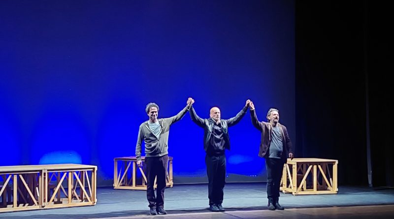 TRE ATTORI : GIANMARCO TOGNAZZI RENATO MARCHETTI FAUSTO SCIARAPPA IN SCENA NELLA RIVISITAZIONE DI SHAKESPEARE PER RENDERE UN OMAGGIO ALL’AMICO