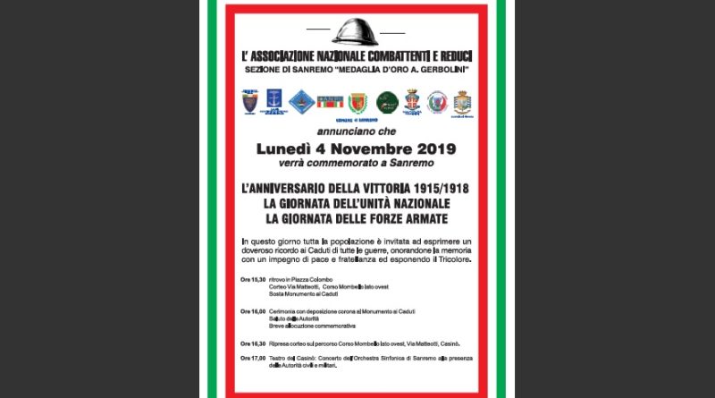 SANREMO – CELEBRAZIONI DELL’UNITA’ NAZIONALE E DELLA GIORNATA DELLE FORZE ARMATE