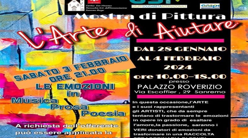 EMOZIONI ALLA MOSTRA “L’ARTE DI AIUTARE” A PALAZZO ROVERIZIO DI SANREMO Sabato 3 febbraio alle ore 21.00 nel Salone di